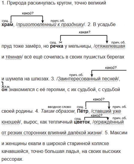 1. Природа раскинулась кругом, точно3 великий храм приготовленный к празднику. 2. В усадьбе пруд тоже замёрз, но речка у мельницы отяжелевшая и тёмная всё ещё сочилась в своих пушистых берегах и шумела на шлюзах. 3. Заинтересованный песней он знакомился с её1 героями, с их судьбой, с судьбой своей родины. 4. Таким образом, Пётр ставший уже юношей вырос, как тепличный цветок ограждённый от резких сторонних влияний далёкой жизни. 5. Максим и женщины ехали в широкой старинной коляске качавшейся, точно большая ладья, на своих высоких рессорах.
