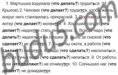 1. Мартышка вздумала (...) трудиться. (И. Крылов) 2. Человек (...) трудит..ся, чтобы жизнь вокруг него становилась прекрасной. 3. Пословица не на ветер (...) молвит..ся. 4. Хороший солдат (...) надеет..ся стать генералом. 5. Всегда надо (...) надеят..ся на лучшее. 6. Быль за сказкой (...) не угонит..ся. 7. Была бы охота, а работа (...) найдёт..ся. 8. Надо (...) наклонит..ся, чтоб из ручья воды (...) напит..ся. 9. От работы руки (...) не отнимут..ся. 10. Солнышко нас (...) не дожидает..ся.