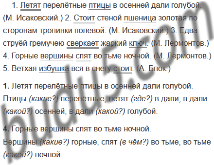 1. Летят перелётные птицы в осенней дали голубой. (М. Исаковский.) 2. Стоит стеной пшеница золотая по сторонам тропинки полевой. (М. Исаковский.) 3. Едва струёй гремучею сверкает жаркий ключ. (М. Лермонтов.) 4. Горные вершины спят во тьме ночной. (М. Лермонтов.) 5. Ветхая избушка вся в снегу стоит. (А. Блок.)