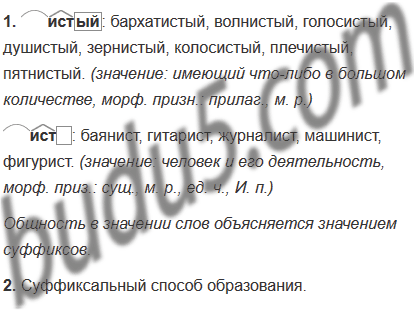 1. истый: бархатистый, волнистый, голосистый, душистый, зернистый, колосистый, плечистый, пятнистый. (значение: имеющий что-либо в большом количестве, морф. призн.: прилаг., м. р.)