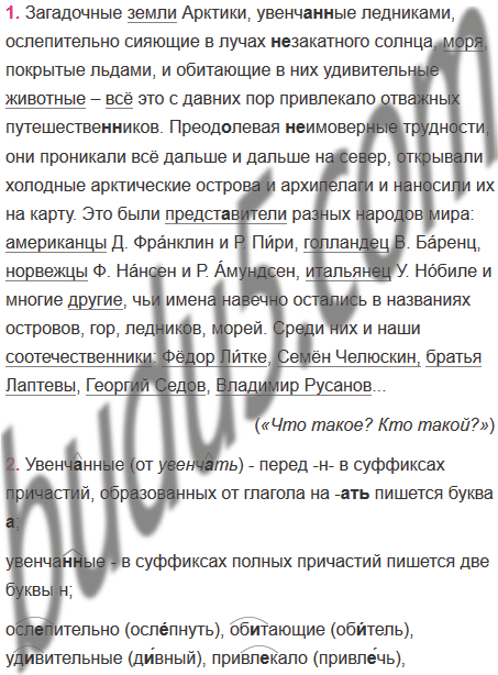 Загадочные земли Арктики увенч..(н, нн)ые ледниками ослепительно сияющие в лучах (не)закатного солнца моря покрытые льдами, и обитающие в них удивительные животные всё это с давних пор привлекало отважных путе-шестве(н, нн)иков. Преод..левая (не)имоверные трудности они проникали всё дальше и дальше на север открывали холодные арктические острова и архипелаги и наносили их на карту. Это были нредст..вители разных народов мира американцы Д. Фра́нклин и Р. Пи́ри, голландец В. Ба́ренц норвежцы Ф. На́нсен и Р. А́мундсен итальянец У. Но́биле и многие другие, чьи имена навечно остались в названиях островов, гор, ледников, морей. Среди них и наши соотечественники Фёдор Ли́тке Семён Челюскин братья Лаптевы Георгий Седов Владимир Русанов...