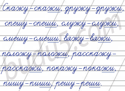 скажу — скажи, дружу — ..., спешу — ..., служу — ..., смешу — ..., вяжу — ..., положу — ..., расскажу — ..., покажу — ..., пишу — ..., решу — ...