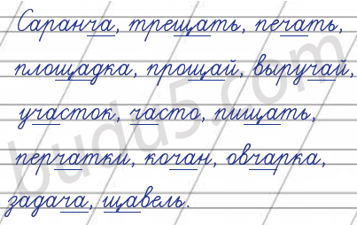 саранч..., трещ...ть, печ...ть, площ...дка, прощ...й, выруч...й, уч..сток, ч..сто, пищ..ть, перч...тки, коч...н, овч...рка, задач..., щ...вель