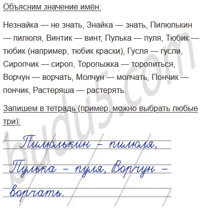 Объясни, что значат имена этих героев. Запиши три имени по образцу.