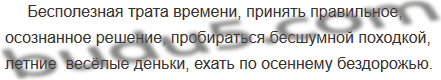 (Бесполезная, необходимая) трата времени, принять правильное (бестолковое, осознанное) решение, пробираться (бесшумной, громкой) походкой, летние (безрадостные, весёлые) деньки, ехать по осеннему (бездорожью, насту).