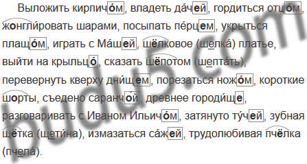 Выложить кирпич..м, владеть дач..й, гордиться отц..м, жонглировать шарами, посыпать перц..м, укрыться плащ..м, играть с Маш..й, ш..лковое платье, выйти на крыльц.., сказать ш..потом, перевернуть кверху днищ..м, порезаться нож..м, короткие ш..рты, съедено саранч..й, древнее городищ.., разговаривать с Иваном Ильичам, затянуто туч..й, зубная щ..тка, измазаться саж..й, трудолюбивая пч..лка.