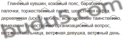 Глиня..ый кувшин, кожа..ый пояс, бараба..ые палочки, торжестве..ый парад, шерстя..ая кофта, деревя..ая мебель, исчезновение таинстве..о, замечание существе..о организацио..ый вопрос, ветр..ная мельница, ветр..ная девушка, ветр..ный день.