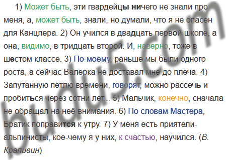 1) Может быть эти гвардейц.. (ни)чего не знали про меня а может быть знали, но думали, что я не опасен для Канцлера. 2) Он учился в два..цать перв..й школе, а она видимо в тридцать второй. И наверно тоже в ш..стом классе. 3) По-моему раньше мы были одного роста, а сейчас Валерка не доставал мне до плеча. 4) Запутанную петлю времени говорят можно рассеч(?) и пробит(?)ся через сотни лет... 5) Мальчик конечно сначала не обращал на неё внимания. 6) По словам Мастера Братик поправит(?)ся к утру. 7) У меня есть приятели-альпинисты, кое-чему я у них к счастью научился. (В. Крапивин)