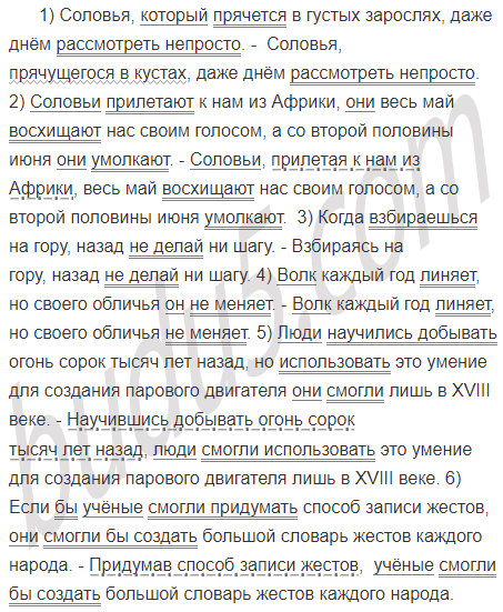 1) Соловья, который прячется в густых зарослях, даже днём рассмотреть непросто. 2) Соловьи прилетают к нам из Африки, они весь май восхищают нас своим голосом, а со второй половины июня они умолкают. 3) Когда взбираешься на гору, назад не делай ни шагу. 4) Волк каждый год линяет, но своего обличья он не меняет. 5) Люди научились добывать огонь сорок тысяч лет назад, но использовать это умение для создания парового двигателя они смогли лишь в XVIII веке. 6) Если бы учёные смогли придумать способ записи жестов, они смогли бы создать большой словарь жестов каждого народа.