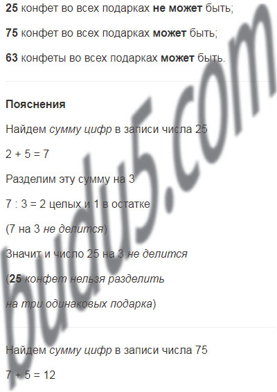 Мама принесла детям три одинаковых подарка. Может ли быть, что во всех подарках было 25 конфет? 75 конфет? 63 конфеты?