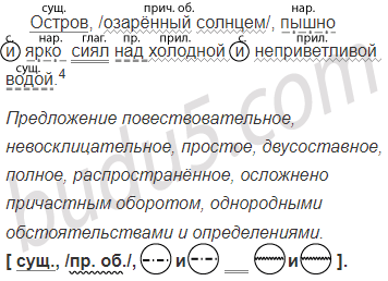 1. Ветер дувший с моря всё время усиливался. 2. Листва сорванная с деревьев закружилась в вихре и стала подниматься кверху. 3. Мыс возвышавшийся над поверхностью озера был похож на утюг. 4. Дорога вся изрытая глубокими колеями шла тёмным хвойным3 лесом. 5. Остров озарённый солнцем пышно и ярко сиял над холодной и неприветливой водой.4