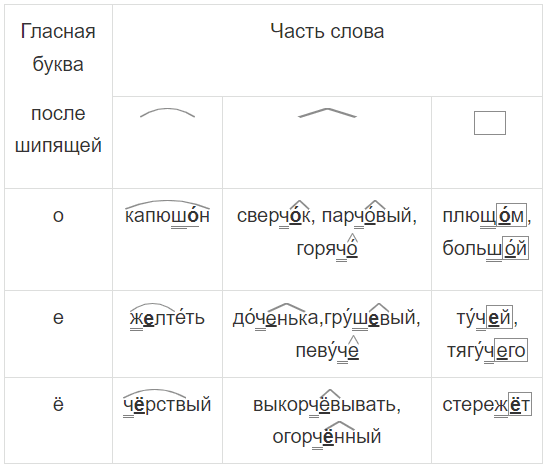 Начертите и заполните тремя словами таблицу «Буквы о, е, ё после шипящих в разных частях слова». Над какими видами орфограмм вы будете работать? Обозначьте условия выбора указанных букв.