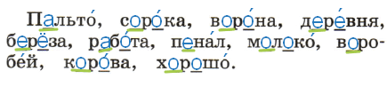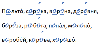П_льто, с_р_ка, в_р_на, д_р_вня, б_р_за, р_б_та, п_нал, м_л_ко, в_робей, к_р_ва, х_р_шо.