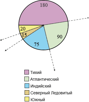 | Название океана | Площадь, млн км2 | Сектор диаграммы, градусы |